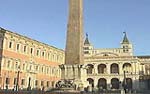 Vi sorge, Eccoci sulla piazza di San Giovanni in Laterano. Vi sorge di fronte alla facciata laterale della basilica, l’Obelisco del Laterano, in granito rosso ed il più alto dei tredici che sorgono sulle piazze di Roma. Fu innalzato nel 1449 a.C. da Totmes III e da suo figlio Totmes IV della XVIII dinastia dei Faraoni e trasportato nel IV sec. a Roma, dove fu collocato nel Circo Massimo (vedi Iter 2). Sisto V lo fece erigere qui dal Fontana (1588).