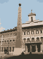 La prima scoperta dell'orologio solare è del 1400 in piazza San Lorenzo in Lucina, dove viene alla luce parte della grande meridiana realizzata dall’imperatore Augusto nel 10 a. C. Quindi - nel 1979 in una cantina al numero 48 di via Campo Marzio , a 7 metri dal livello stradale e coperta da 10 centimetri di acqua - si scoprono grandi lastre di travertino con dei segni zodiacali e liste di bronzo orizzontali e verticali. Si trattava di un grande orologio solare che si estendeva nel Campo Marzio su una superficie di 160 metri per 60, tra le attuali via della Lupa e piazza San Lorenzo in Lucina. Le iscrizioni incise sul basamento ricordano la conquista dell’Egitto da parte di Augusto, che fece trasportare a Roma l’obelisco. Il matematico Facundus Novius ideò l'enorme meridiana solare in cui, da un’altezza di cento piedi romani ( circa 29 metri ), l’obelisco fungeva da gnomone indicando con la sua ombra sul terreno: le ore, i giorni e e i mesi. Al tramonto del 23 settembre, giorno e ora della nascita di Augusto, l´ombra toccava esattamente l´Ara Pacis. L’opera rimase in funzione solo una cinquantina d’anni. Plinio racconta infatti che crollò durante un terremoto. I frammenti dell’obelisco furono ritrovati dall’architetto Giovanni Antinori nel 1748; per il suo restauro furono usati dei frammenti in granito rosso della Colonna Antonina (scoperta nel1703) e, tra il 1790 e il 1792 venne eretto in piazza Montecitorio davanti al palazzo dei Tribunali, oggi della Camera dei Deputati. Tentò di restaurarlo papa Pio VII, ma un parziale recupero della sua finzione si ebbe solo il 7 giugno 1998, con l’impianto di dodici selci-guida sulle gradinate antistanti il palazzo. La parte vecchia del Palazzo di Montecitorio, sede della Camera dei Deputati, era palazzo Innocenziano costruito dal Bernini (1653-55).