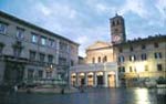 S. Maria in Trastevere che troviamo nell’omonima piazza e' la più antica basilica di Roma. Fondata nel 221 da San Callisto e terminata da San Giulio (341), venne ricostruita nel XII sec. da Innocenzo II. La facciata fu decorata, nello stesso secolo, con mosaici ed affreschi, in seguito restaurati da Pietro Cavallini. Clemente XI, nel Settecento, fece erigere il portico da Carlo Fontana , mentre Pio IX (1870) ordinò alcuni restauri. Nell’interno meravigliosi mosaici decorano l’abside mentre tra le finestre spiccano i mosaici raffiguranti le storie della Vergine del Cavallini. A fianco della facciata ammiriamo un bel campanile romanico del XII secolo, alla cui sommità troviamo un’edicola con mosaico rappresentante una Madonna col Bambino.