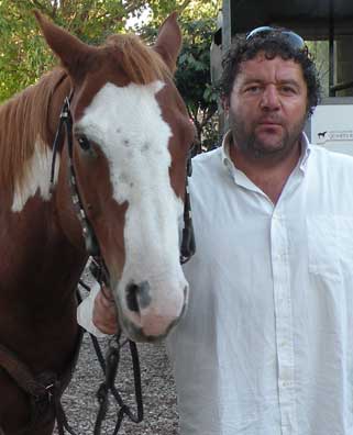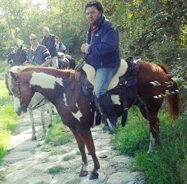Carlo Formica è uno dei due medici veterinari del gruppo, ha 43 anni e monta Pioggia, un paint di 6 anni alto, al garrese 1,63. Tra i suoi compiti durante l'impegnativo viaggio attraverso l'Italia, che dovrà affrontare un passo oltre i mille metri di quota in una stagione non certo estiva, sara anche quello di tenerci informati sullo stato di forma dei cavalli che partecipano al viaggio. |