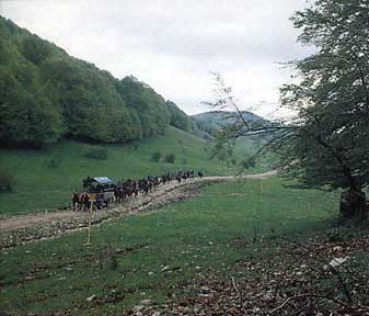 Dopo la sosta notturna arriviamo nel comune di Tagliacozzo, nella valle con i suoi palazzetti cinquecenteschi e la bella piazza dell'Obelisco. Qui, nel 1268, si consumò la tragedia di Corradino di Svevia, braccato da Carlo d'Angiò. Ma la via rimane a mezza costa e raggiungiamo un altro luogo magnifico, Casal del Pozzo... e ci troviamo su un set cinematografico, così almeno sembra, con mandrie di cavalli e vacche al pascolo in una conca ricca d'acqua. |