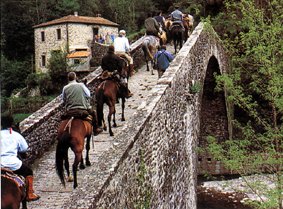 Da Tagliacozzo in avanti ci siamo mantenuti in quota e, attraverso boschi e sentieri, abbiamo valicato il confine tra Abruzzo e Lazio. Attraversato il borgo cinquecentesco di Orvinio, siamo entrati nel territorio di Farfa, un tempo monastero tra i più importanti d'Europa, a cui si deve, pare, l'invenzione del capolettera maiuscolo. Dopo Farfa siamo giunti a Civita castellana, dominata dalla cupa rocca pentagonale, dove scontarono la loro amara condanna i briganti Gasparone e i suoi compagni, segregati dalla giustizia pontificia per 44 anni e liberati nel 1870 dalla grazia del Re d'Italia. A Civita Castellana abbiamo goduto del meritato riposo, in attesa di riprendere il percorso sul Grande Trek. Questo è avvenuto la stagione seguente con la grande avventura, trasmessa nel 1997 da Linea verde con il nome di "Vulci - Canossa" con la preziosa assistenza dell'Istituto Geografico Militare. |