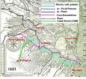 Durante il viaggio a cavallo da Roma a Verona, dopo il passo della Futa siamo scesi nella parte orientale della pianura Padana. Una delle tappe è stata Sant’Agostino, comune in provincia di Ferrara in cui, il terremoto del maggio 2012 causò due vittime tra i lavoratori di una fabbrica di ceramiche. Come abbiamo visto costeggiando i canali, questa è un'area importante per la regimentazione delle acque dei fiumi che da qui dirigono verso la foce adriatica. Nei secoli molti tentarono di governare le piene che spesso causavano gravi danni. Da Sant’Agostino, presso il Bosco della Panfilia, nel XVIII secolo iniziarono i lavori per lo scavo di una derivazione di 30 km, tra il fiume Reno e il letto dell'antico Po di Primaro, che termina nella località di Saiarino nei pressi di Argenta, in provincia di Ferrara. Era il pontificato di Benedetto XIV da cui il nome di Cavo Benedettino. Ma questo non bastò e nuovi lavori più risolutivi per scolmare il Reno e per itrrigare nella stagione secca le colture, furono eseguiti nei primi anni del 1800 sotto Napoleone Bonaparte: il cavo napoleonico. |